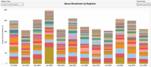 We will offer an initial thought on DAAR produced reporting. ICANN should really separate out spam reporting from phishing, malware, and botnets. It’s not that spam isn’t important to measure, but that the volume of spam prevents the reader from seeing any trends in the other harms so measuring it, but visualizing it separately would be helpful.